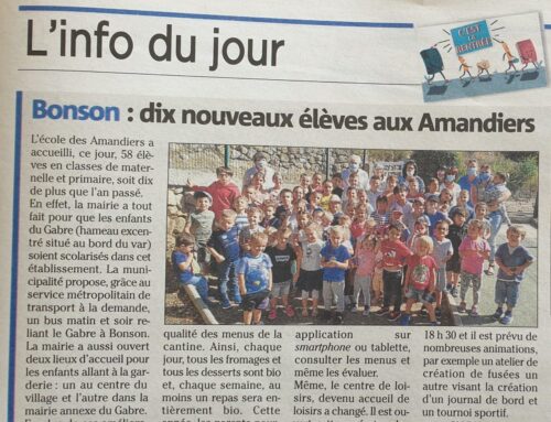 Le village de Bonson dispose d’une école de trois classes, cycles 1, 2 et 3. Située à la sortie du village, au quartier des amandiers qui lui a donné son nom, elle offre aux enfants une vue plongeante sur la vallée du Var et la mer, et permet un panel d’activités « extra scolaires » varié, telles que :