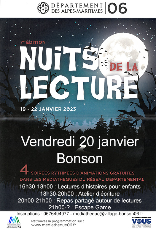 Inscriptions et renseignements : 0676494977 ou mediatheque@village-bonson06.fr